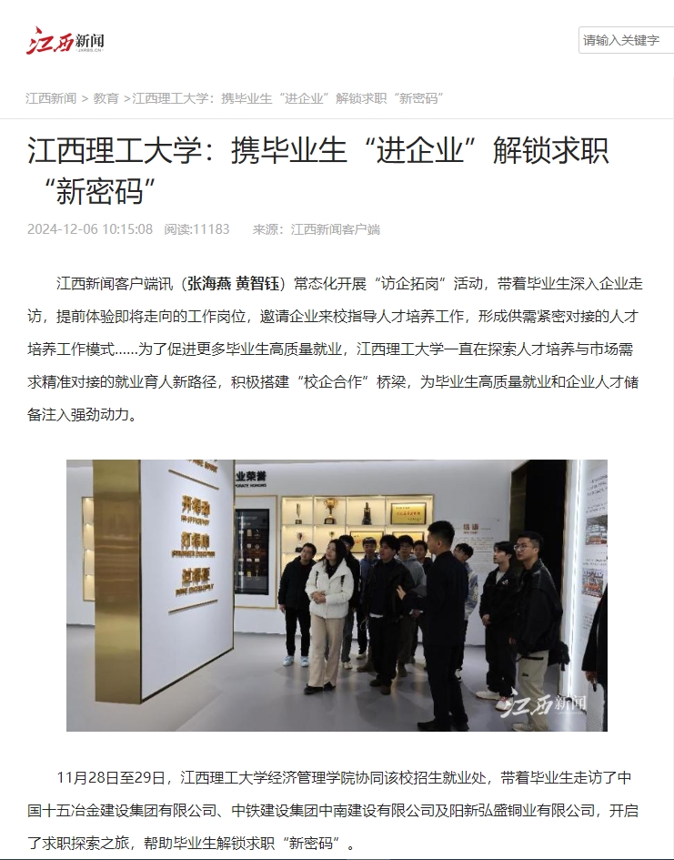 协同该校招生就业处,带着毕业生走访了中国十五冶金建设集团有限公司、中铁建设集团中南建设有限公司及阳新弘盛铜业有限公司,开启了求职探索之旅,帮助毕业生解锁求职“新密码”。