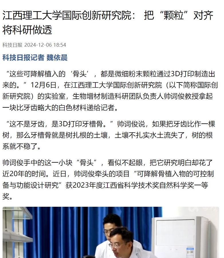 帅词俊手中的这一小块“骨头”,看似不起眼,把它研究明白却花了近20年的时间。近日,帅词俊牵头的项目“可降解骨植入物的可控制备与功能设计研究”获2023年度江西省科学技术奖自然科学奖一等奖。
