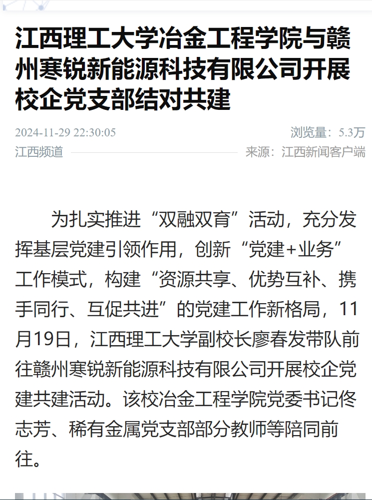 当天上午10时,廖春发一行在赣州寒锐新能源科技有限公司董事长刘政、总经理文定强的陪同下,来到企业生产现场,参观了解钴萃取、电解等先进工艺和设备。随后,双方召开了校企支部共建交流会。