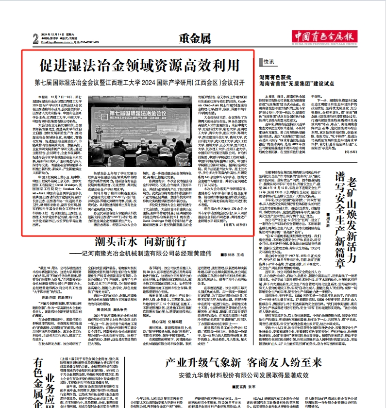 唐云志表示,希望以本次大会为契机,进一步推动湿法冶金领域绿色化、高端化、智能化发展。