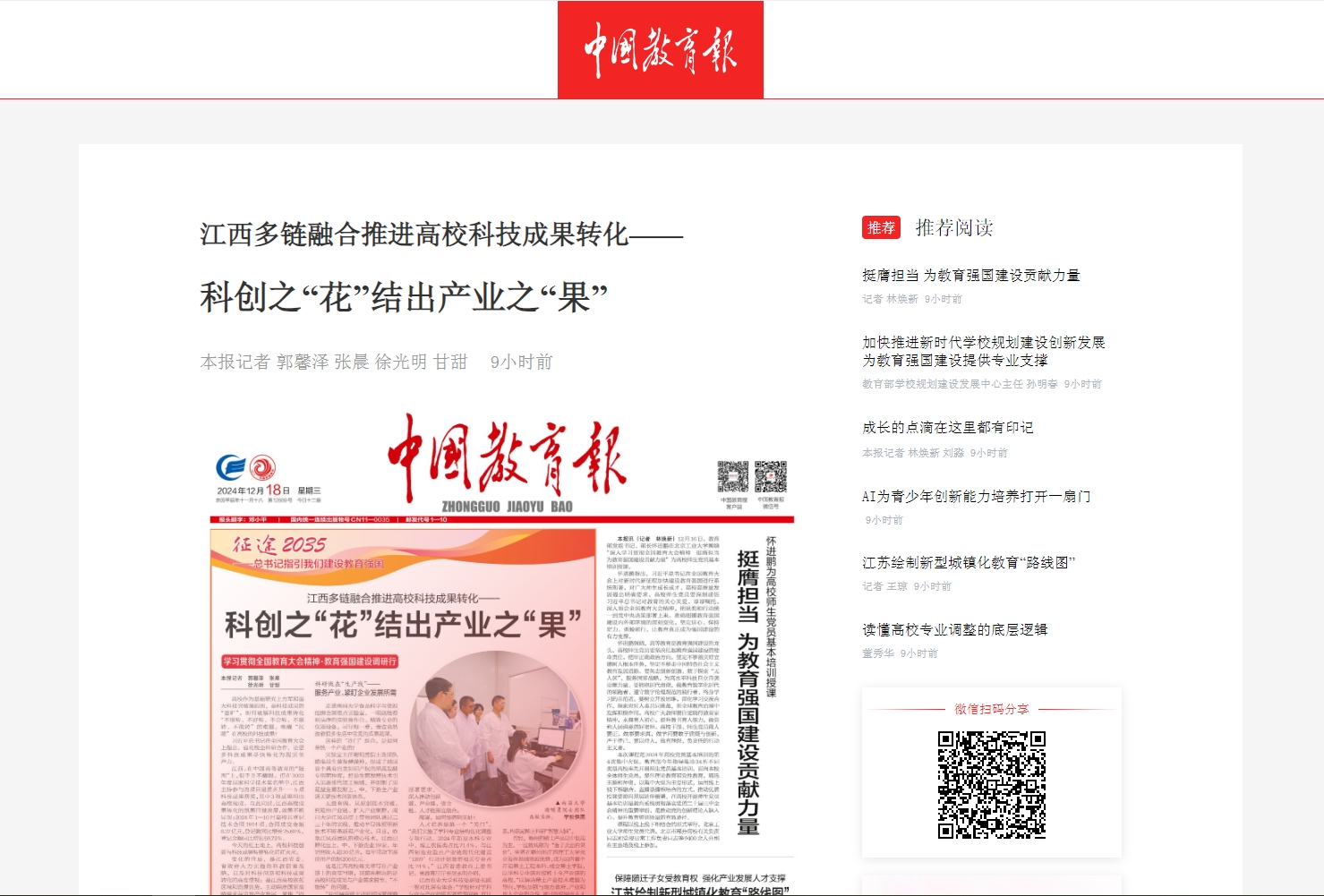 “到2035年建成教育强国,是党中央作出的重大决策部署,是习近平总书记念兹在兹、殷切期盼的‘国之大者’。我们将全面贯彻落实党的二十届三中全会和全国教育大会精神,大力推动创新链、产业链、资金链、人才链深度融合,加强高校科学研究和技术研发,促进科技成果转移转化,更好服务江西经济社会高质量发展。”江西省委教育工委书记、省教育厅厅长吴永明的话语掷地有声。