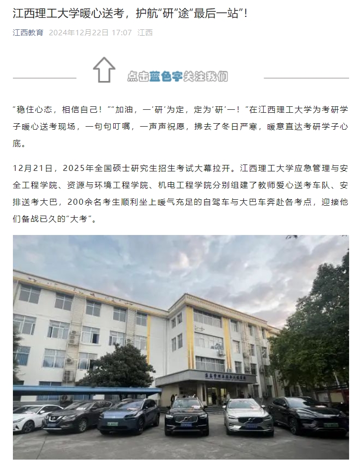 考研学子坐上送考车辆出发考场当一辆辆送考车辆缓缓启动时,考研学子背负着梦想和希望,踏上了通向成功的征程。无声的出征号角响起,鼓动着每个考研学子的心。车队缓缓启动,送考途中,自驾送考的老师与送考大巴皆严格遵守交通规则,把控行车速度,确保安全、准时将考生们送达考场。此外,他们还时刻关注考生们的情绪状态,及时疏导大家的紧张情绪,增强应试信心。“研”途漫漫,昼夜兼程,各种滋味只有自己品尝。回首望去,备战考研的征途,江理的考研学子从来不是孤军奋战。