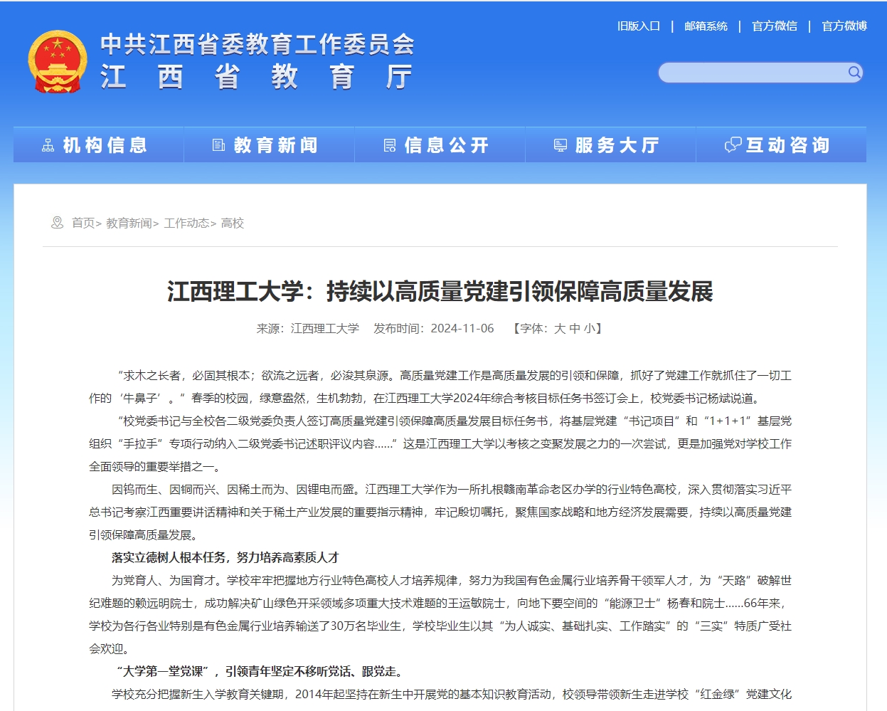 作为一所扎根赣南革命老区办学的行业特色高校,深入贯彻落实习近平总书记考察江西重要讲话精神和关于稀土产业发展的重要指示精神,牢记殷切嘱托,聚焦国家战略和地方经济发展需要,持续以高质量党建引领保障高质量发展。