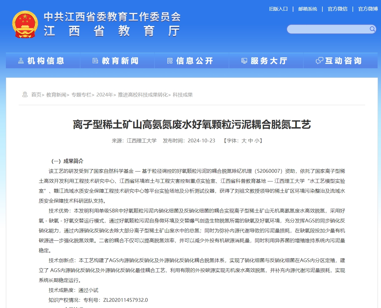 该工艺的研发受到了国家自然科学基金 — 基于粒径调控的好氧颗粒污泥的耦合脱氮除钇机理(52060007)资助,依托了国家离子型稀土高效开发利用工程技术研究中心、江西省环境岩土与工程灾害控制重点实验室、江西省科普教育基地 — 大发娱乐