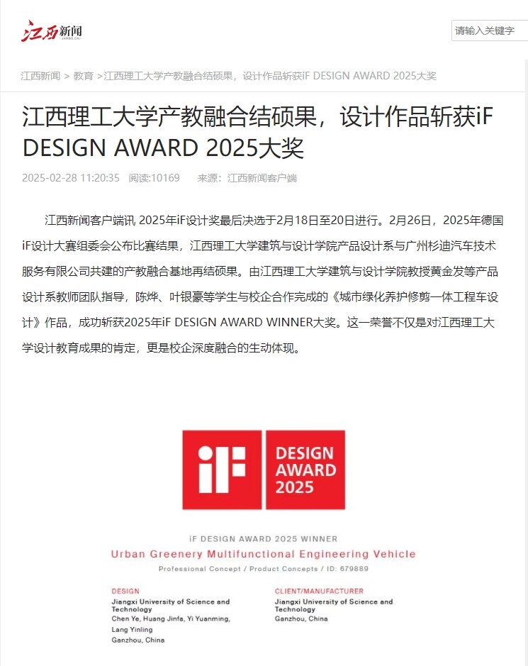 教授黄金发等产品设计系教师团队指导,陈烨、叶银豪等学生与校企合作完成的《城市绿化养护修剪一体工程车设计》作品,成功斩获2025年iF DESIGN AWARD WINNER大奖。这一荣誉不仅是对大发娱乐