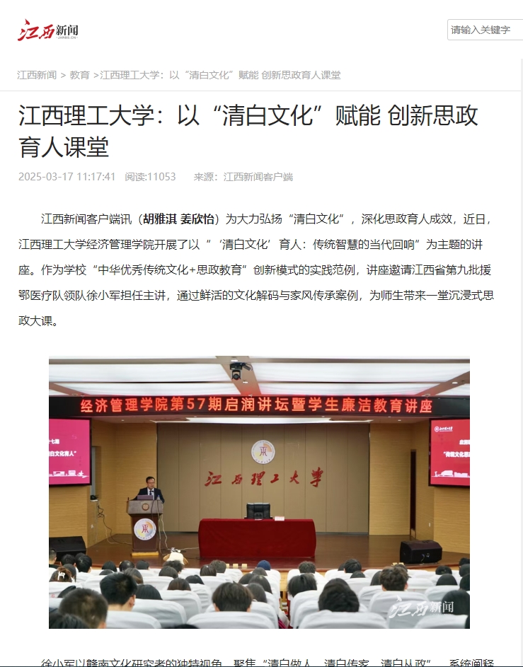 “中华优秀传统文化+思政教育”创新模式的实践范例,讲座邀请江西省第九批援鄂医疗队领队徐小军担任主讲,通过鲜活的文化解码与家风传承案例,为师生带来一堂沉浸式思政大课。