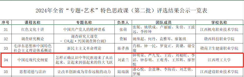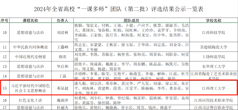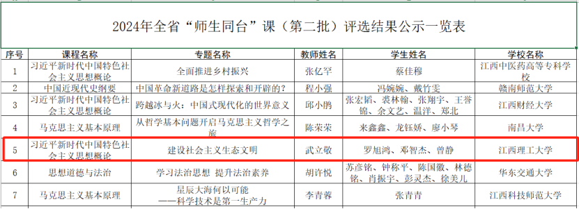 邓显超教授申报的《习近平新时代中国特色社会主义思想概论》课程获批全省“一课多师”团队;龚金花老师申报的刘启耀纪念馆实践教学基地获批全省家门口的“大思政课”实践教学基地;朱贤凌老师和中央红军长征出发纪念馆钟敏老师主讲的《聆听历史回响 阔步新的长征》、李丹老师和章江街道人大工委主任陈华老师讲授的《“小站点”书写全过程人民民主“大文章”》获评全省高校“双师同堂”课;武立敬老师主讲的《建设社会主义生态文明》获评全省“师生同台”课;刘素兰老师申报的《怎样正确认识中华民族迎来了从站起来、富起来到强起来的伟大飞跃》获批全省“专题+艺术”特色思政课。