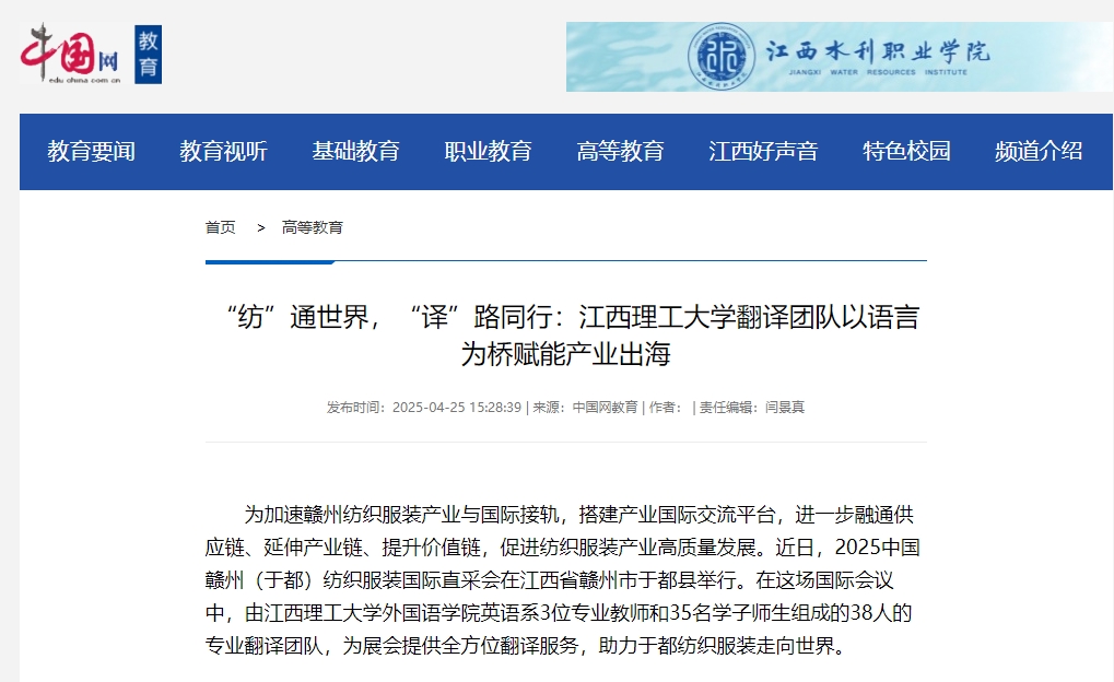 师生在直采会中的表现,不仅展现了高校翻译人才培养的显著成果,更印证了“语言联通世界”的深远意义。在为赣州纺织服装“出海”按下加速键的同时,更是践行深化应用型人才培养改革的生动注脚。当纺织服装产业的“中国制造”通过精准的语言走向全球,当江理学子在实战中成长为行业需要的复合型人才,这条产教融合的道路,正为地方经济的高质量发展注入新的活力。(尧佳琳、徐玉冉)