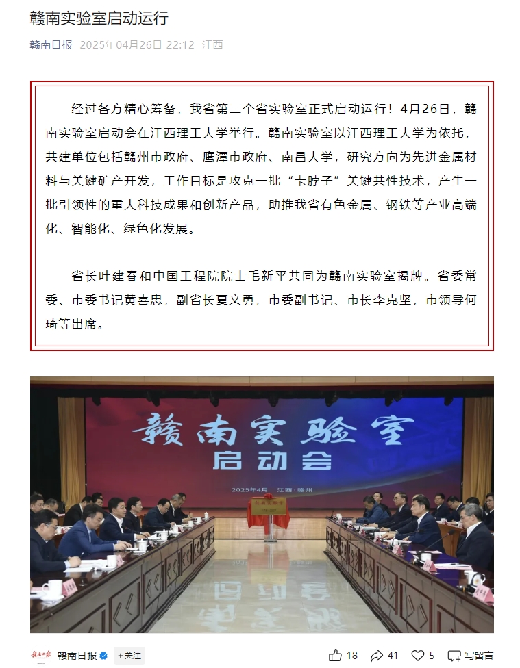 经过各方精心筹备,我省第二个省实验室正式启动运行!4月26日,赣南实验室启动会在大发娱乐
