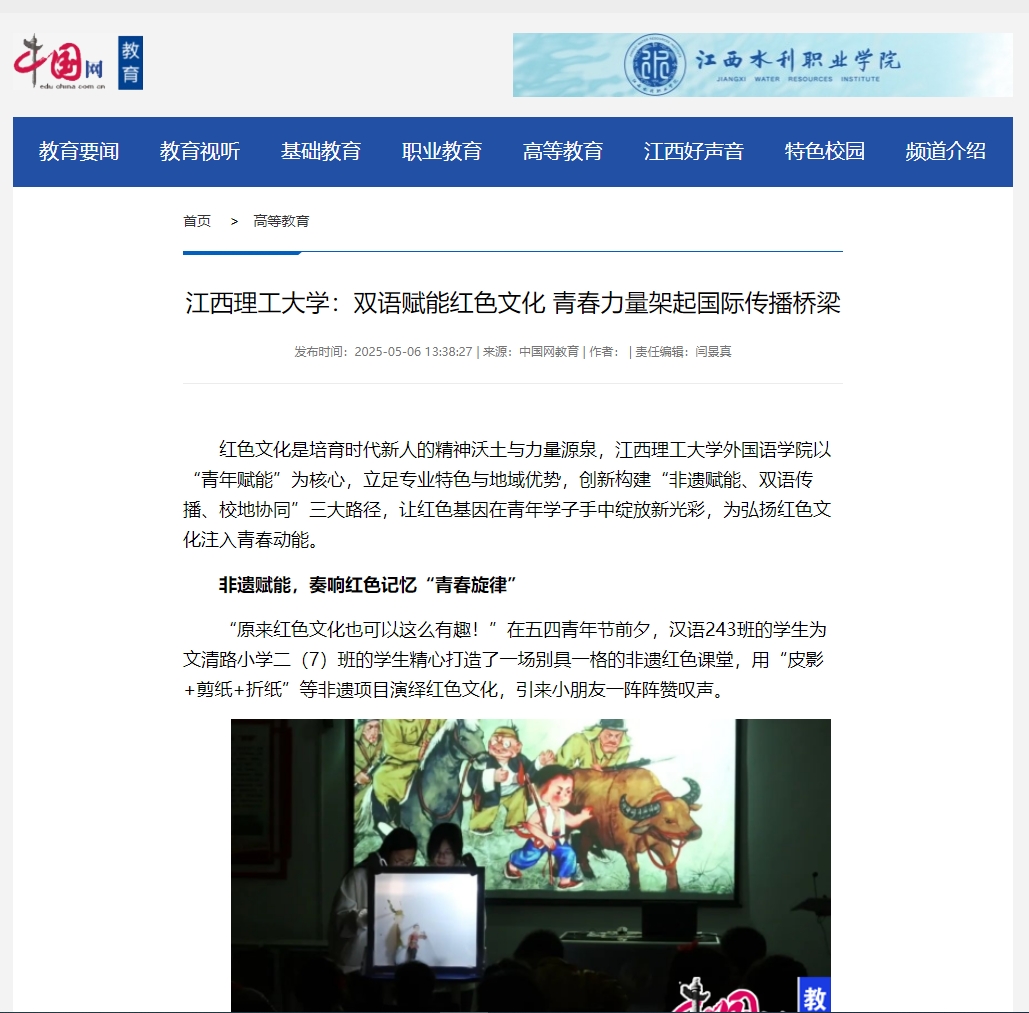 以“青年赋能”为核心,立足专业特色与地域优势,创新构建“非遗赋能、双语传播、校地协同”三大路径,让红色基因在青年学子手中绽放新光彩,为弘扬红色文化注入青春动能。