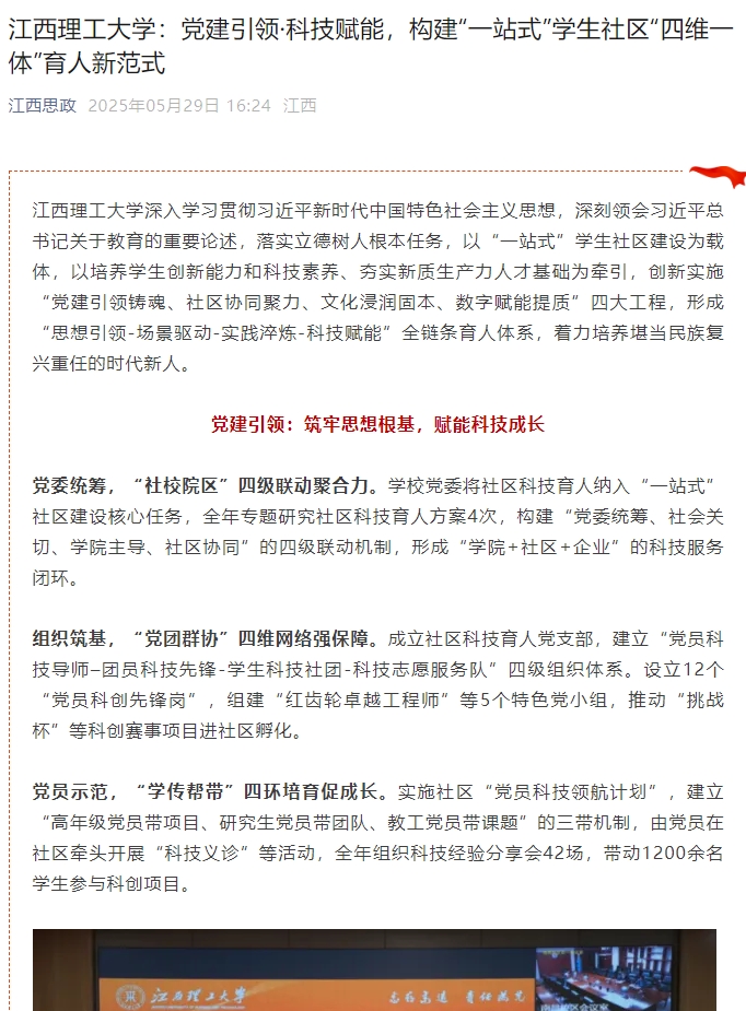 深入学习贯彻习近平新时代中国特色社会主义思想,深刻领会习近平总书记关于教育的重要论述,落实立德树人根本任务,以“一站式”学生社区建设为载体,以培养学生创新能力和科技素养、夯实新质生产力人才基础为牵引,创新实施“党建引领铸魂、社区协同聚力、文化浸润固本、数字赋能提质”四大工程,形成“思想引领-场景驱动-实践淬炼-科技赋能”全链条育人体系,着力培养堪当民族复兴重任的时代新人。