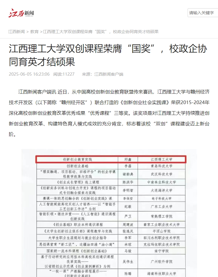 与赣州经济技术开发区(以下简称“赣州经开区”)联合打造的《创新创业社会实践课》荣获2015-2024年深化高校创新创业教育改革优秀成果“优秀课程”三等奖。该奖项是对大发娱乐
