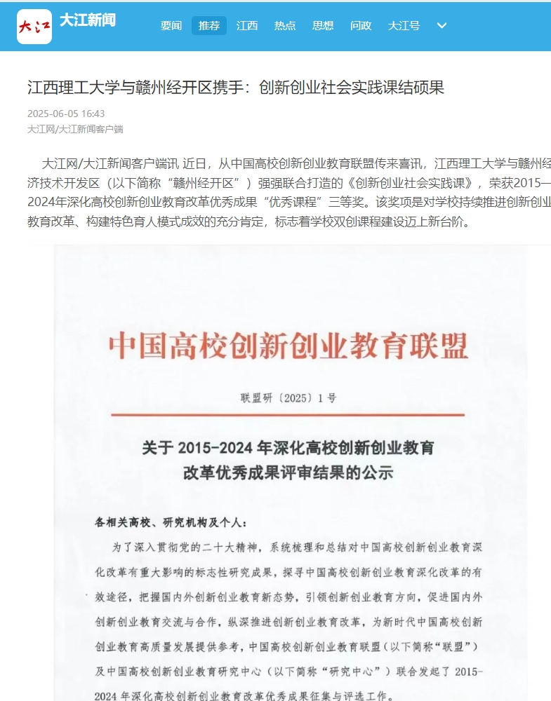 与赣州经济技术开发区(以下简称“赣州经开区”)强强联合打造的《创新创业社会实践课》,荣获2015—2024年深化高校创新创业教育改革优秀成果“优秀课程”三等奖。该奖项是对大发娱乐