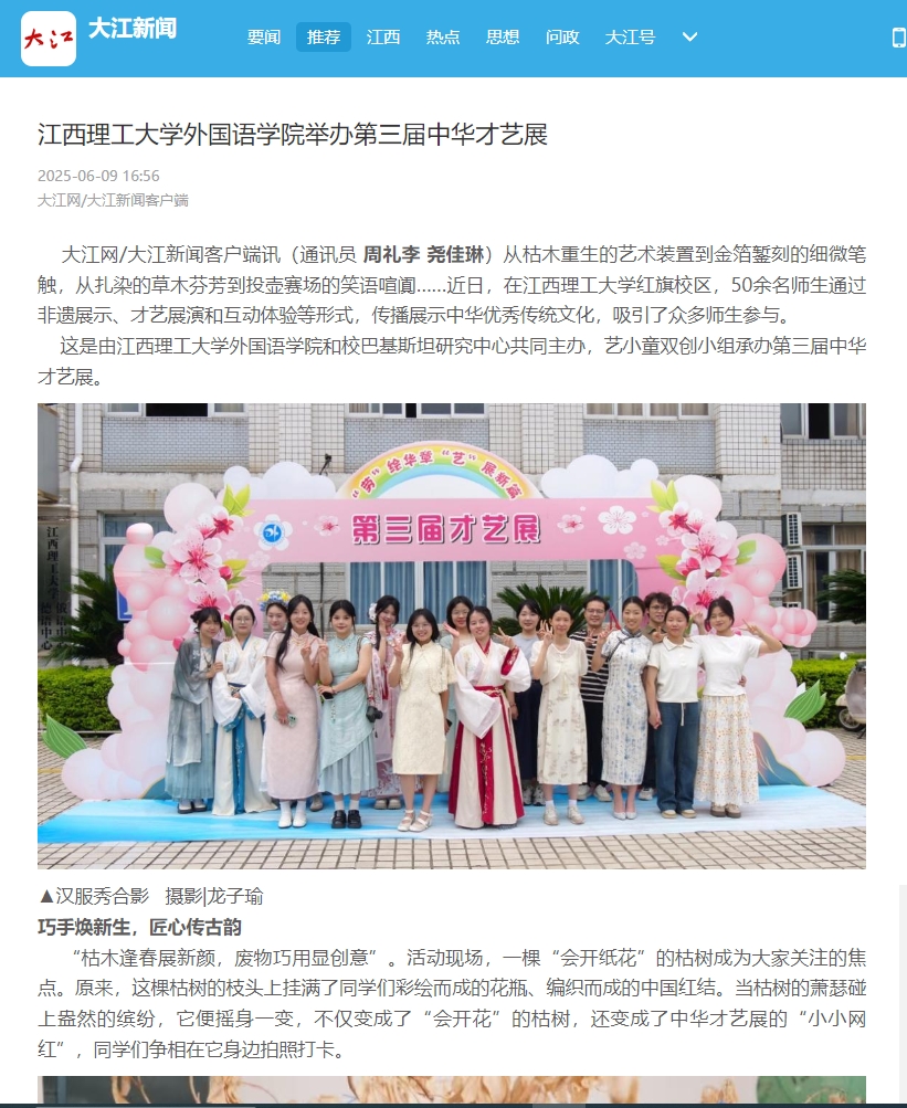 在才艺表演环节,身着汉服的舞者在水袖轻扬间演绎着古典舞的含蓄与优雅;悠扬的竹笛声、古筝声时而清越激昂,时而婉转低回,将中国传统音乐的意境之美娓娓道来;武术表演者的招式行云流水,刚柔并济,诠释着中华武术的力量与柔美。小提琴、吉他、萨克斯等西方乐器演绎的中国乐曲,完美融合了东方的典雅与西方的激情,展现出独特的中西合璧之美。这些精彩纷呈的表演让在场师生都沉浸在这浓郁的文化氛围中。