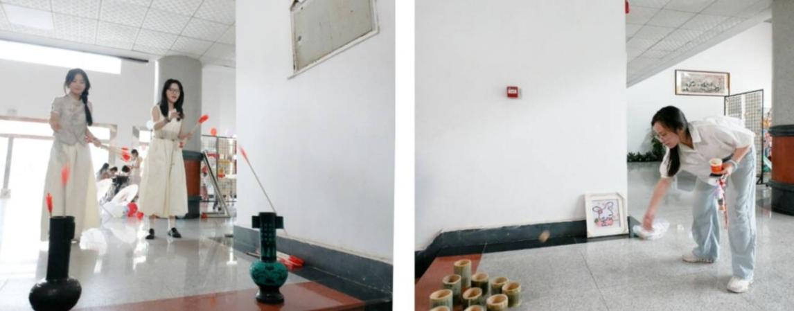 在互动游戏区,欢声笑语更是接连不断。此次才艺展将游戏环节分为了“乾坤一掷”的投壶环节和“灵珠入杯”的掷球环节。投壶场地前,同学们调整着姿势,全神贯注地将竹矢投出,只听“叮”的一声,竹矢正中壶心,欢呼声、赞叹声便交织在一起;掷球游戏区则充满现代活力,参与者瞄准目标,精准投掷,有时球在竹筒沿转三圈后掉在地上,有时又会一发命中稳稳落在其中,但不管结果如何,同学们都在寓教于乐的游戏中感受着传统文化的魅力,体会着古礼今玩的雅趣和古今交融的欢腾,也增进了彼此间的交流与友谊。