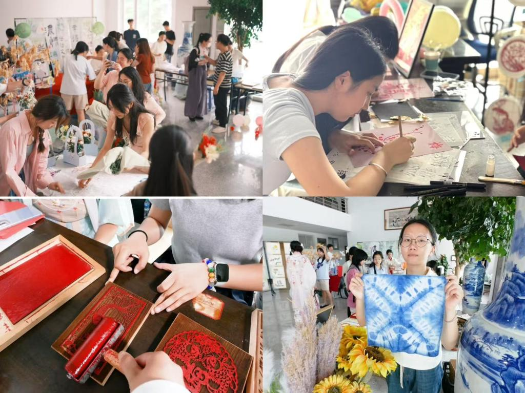 ▲学生体验插花、拓印、扎染、金箔画等活动 摄影|袁丹