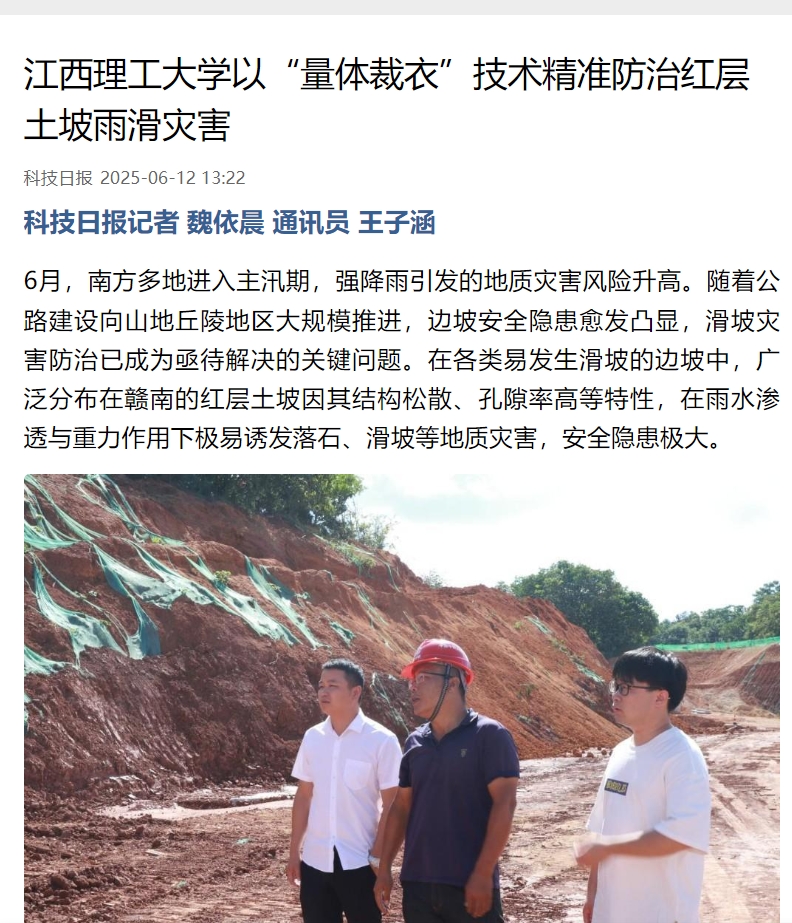 6月,南方多地进入主汛期,强降雨引发的地质灾害风险升高。随着公路建设向山地丘陵地区大规模推进,边坡安全隐患愈发凸显,滑坡灾害防治已成为亟待解决的关键问题。在各类易发生滑坡的边坡中,广泛分布在赣南的红层土坡因其结构松散、孔隙率高等特性,在雨水渗透与重力作用下极易诱发落石、滑坡等地质灾害,安全隐患极大。