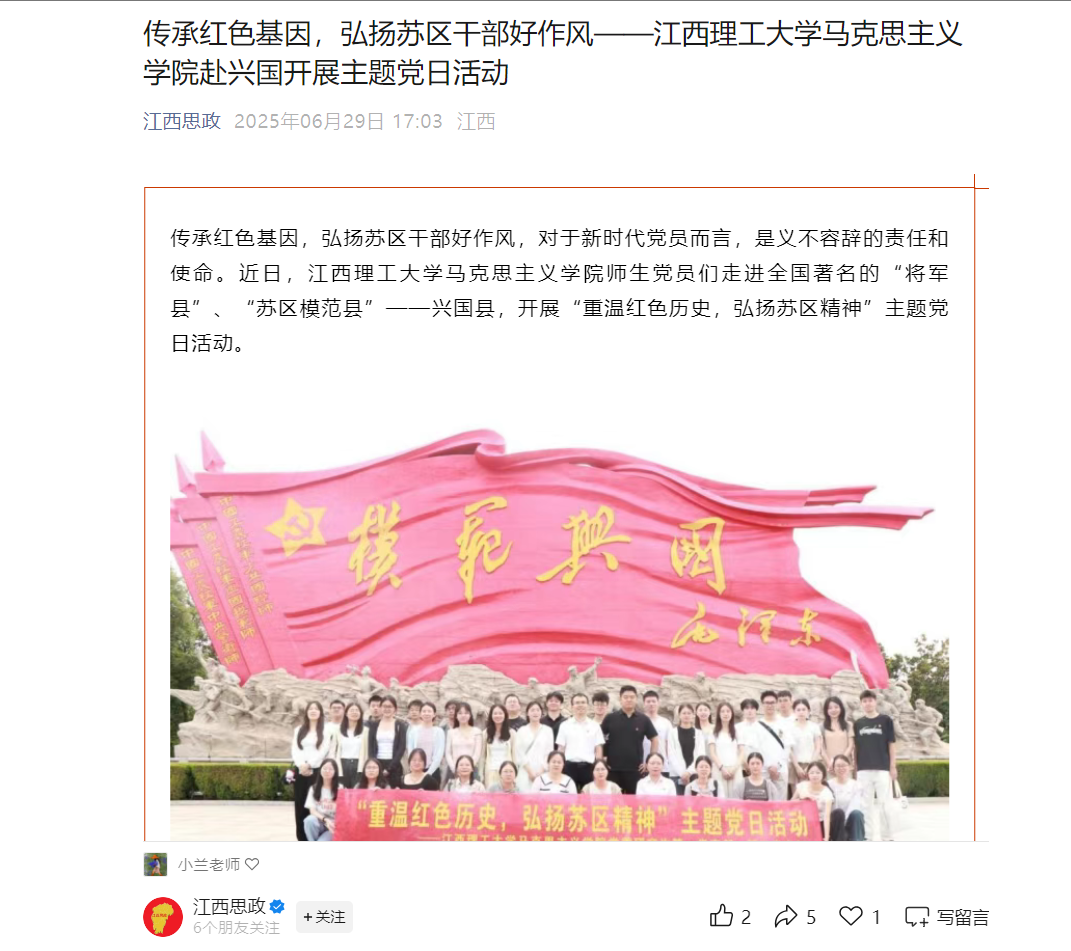 “山山埋忠骨,岭岭皆丰碑。”此次主题党日活动,以兴国这片红色热土为生动的历史教科书和实践大课堂,使江理的党员们深刻认识到,苏区干部以一身正气和两袖清风赢得群众拥护,新时代党员更应该传承这份政治操守,在“红领金”党建品牌建设中永葆清廉本色,以优良作风践行初心使命,争当有理想、敢担当、能吃苦、肯奋斗的新时代好青年。