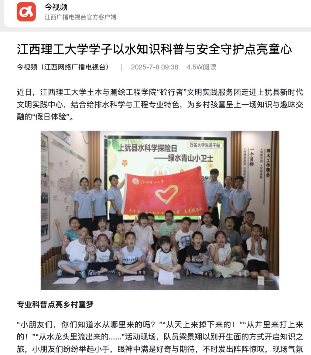 “砼行者”文明实践服务团走进上犹县新时代文明实践中心,结合给排水科学与工程专业特色,为乡村孩童呈上一场知识与趣味交融的“假日体验”。