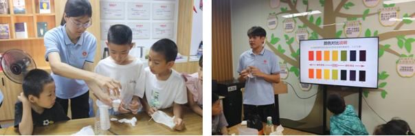 实践操作环节,队员们化身“科学导师”,带领小朋友们分组合作组装简易净水器。“先把这个滤网放在这里,然后再把活性炭放进去……”小朋友们围在实验桌旁,眼睛紧紧盯着队员手中的材料,认真模仿,齐心协力地组装着。随着污水缓缓流入装置,浑浊的水流经层层过滤变得清澈,小朋友们兴奋地跳了起来,“哇,水变干净啦!”另一边,队员金梅娟带领开展pH试纸实验,蘸取不同水样,看着试纸颜色渐渐变化,有的变浅红,有的泛着蓝,直观展现水的酸碱度奥秘,现场充满了惊喜的呼声。张小明小朋友兴奋地说:“太神奇了,我回家也要给爸爸妈妈做这个实验!”