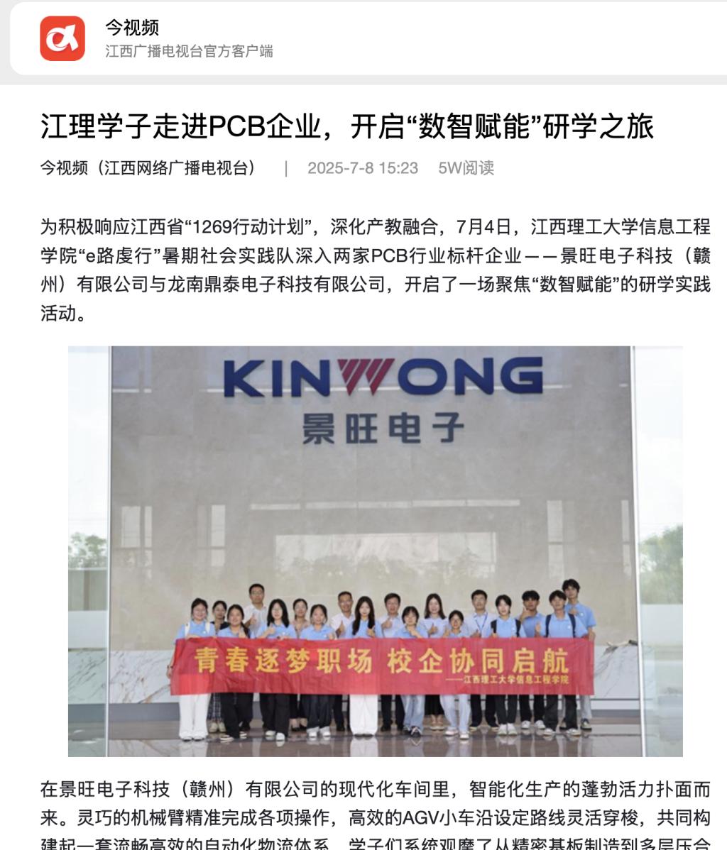 景旺电子与龙南鼎泰作为江西省推动制造业高质量发展的典范,其以智能化实践为新质生产力发展提供了鲜活样板。此次社会实践活动,不仅让江西理工学子深入了解了PCB产业“智造”升级的现状与趋势,更有效搭建起一座连接校园与产业的桥梁,为培育未来卓越工程师奠定了坚实的基础,也为区域乃至国家智能制造发展注入了新动能。(图/李展翼、文/胡宇芩 刘晨曦)