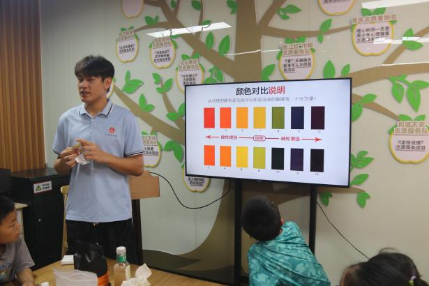 实践操作环节,队员们化身“科学导师”,带领小朋友们分组合作组装简易净水器。“先把这个滤网放在这里,然后再把活性炭放进去……”小朋友们围在实验桌旁,眼睛紧紧盯着队员手中的材料,认真模仿,齐心协力地组装着。随着污水缓缓流入装置,浑浊的水流经层层过滤变得清澈,小朋友们兴奋地跳了起来,“哇,水变干净啦!”另一边,队员金梅娟带领开展pH试纸实验,蘸取不同水样,看着试纸颜色渐渐变化,有的变浅红,有的泛着蓝,直观展现水的酸碱度奥秘,现场充满了惊喜的呼声。张小明小朋友兴奋地说:“太神奇了,我回家也要给爸爸妈妈做这个实验!”