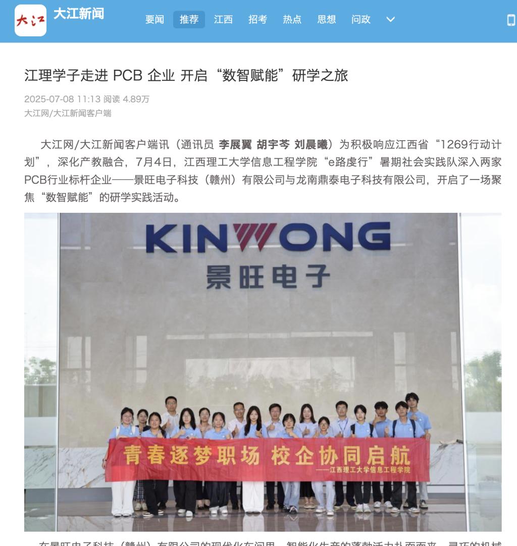 “e路虔行”暑期社会实践队深入两家PCB行业标杆企业——景旺电子科技(赣州)有限公司与龙南鼎泰电子科技有限公司,开启了一场聚焦“数智赋能”的研学实践活动。