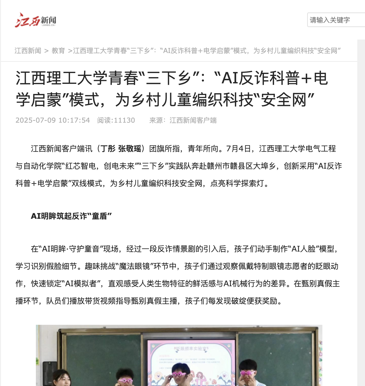 “红芯智电,创电未来”“三下乡”实践队奔赴赣州市赣县区大埠乡,创新采用“AI反诈科普+电学启蒙”双线模式,为乡村儿童编织科技安全网,点亮科学探索灯。