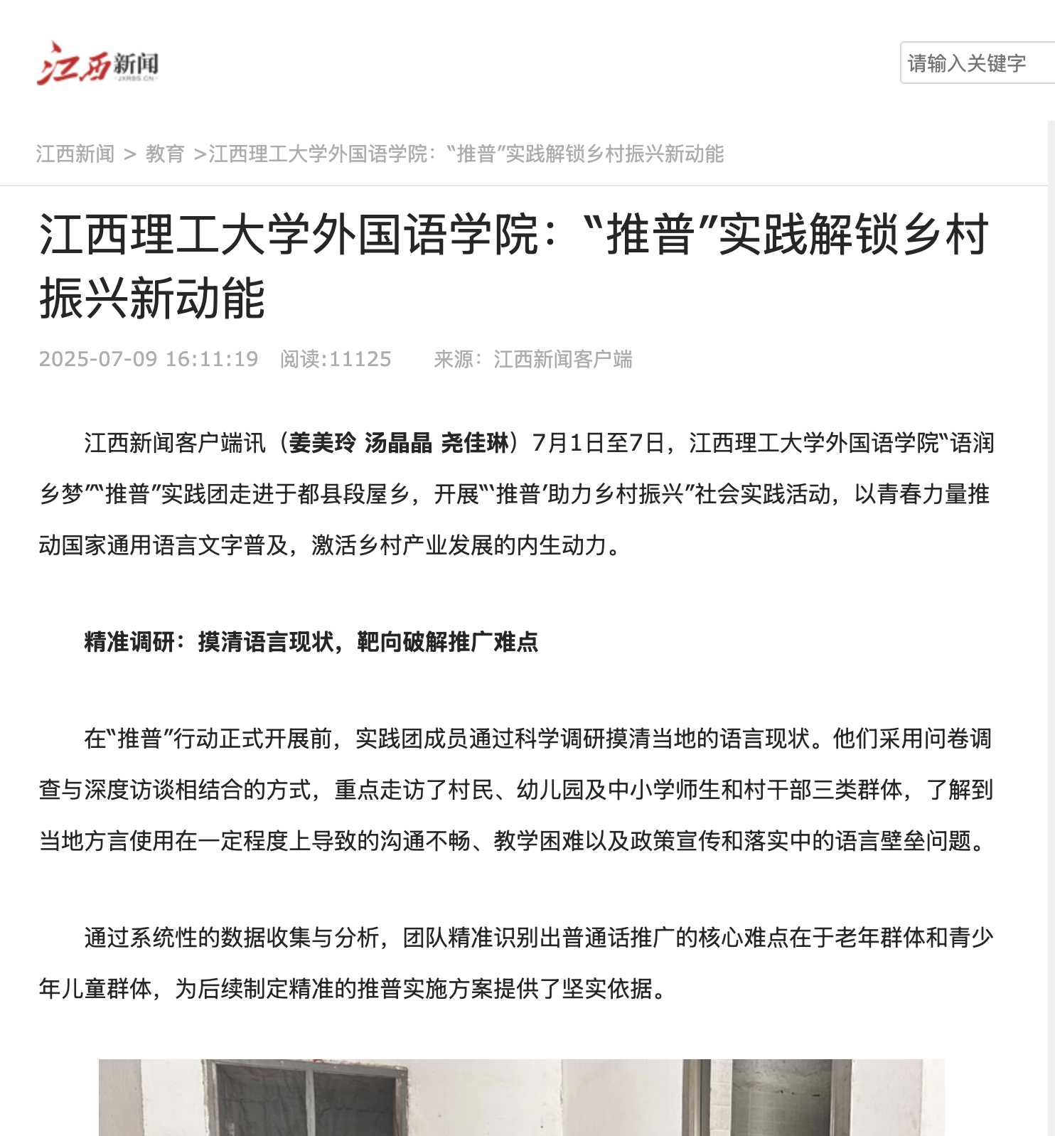 “语润乡梦”“推普”实践团走进于都县段屋乡,开展“‘推普’助力乡村振兴”社会实践活动,以青春力量推动国家通用语言文字普及,激活乡村产业发展的内生动力。
