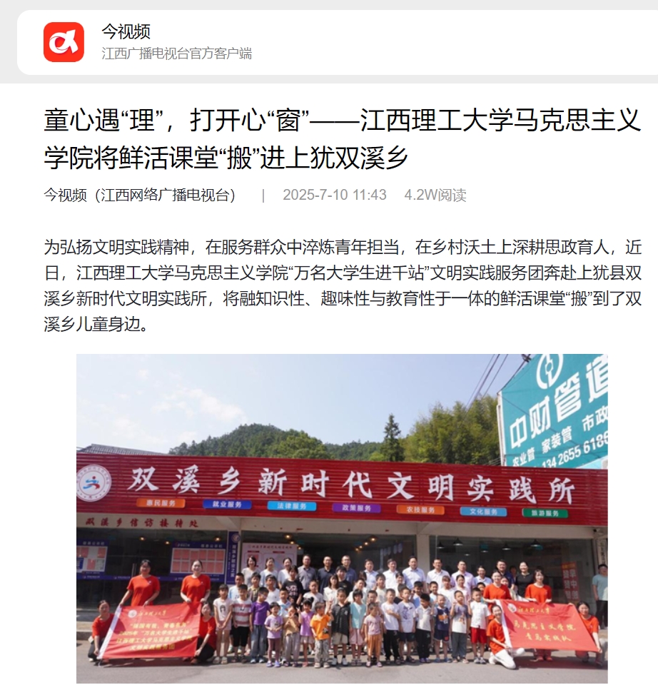“万名大学生进千站”文明实践服务团奔赴上犹县双溪乡新时代文明实践所,将融知识性、趣味性与教育性于一体的鲜活课堂“搬”到了双溪乡儿童身边。