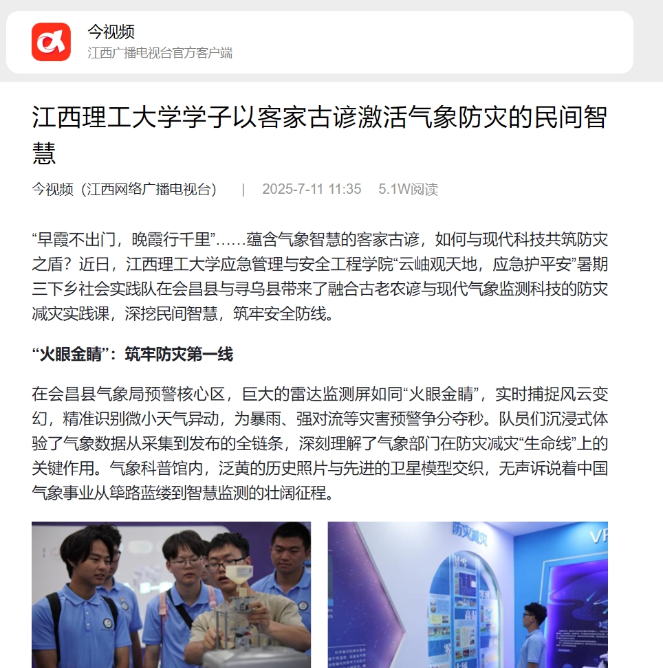 现代气象科技赋予我们洞悉风险的“千里眼”,而客家农谚却是先民解读天象的“密码本”,节气规律揭示了灾害发生的“时间窗”,而乡土顺口溜则是让知识扎根、代代相传的“金话筒”。实践队员将这四者有机融合,用乡音乡情讲好安全故事,为会昌县与寻乌县的村民编织出一张“知天时、接地气、会避险”的全民防灾安全网。(彭子晴、陈依琳、程嘉宇)