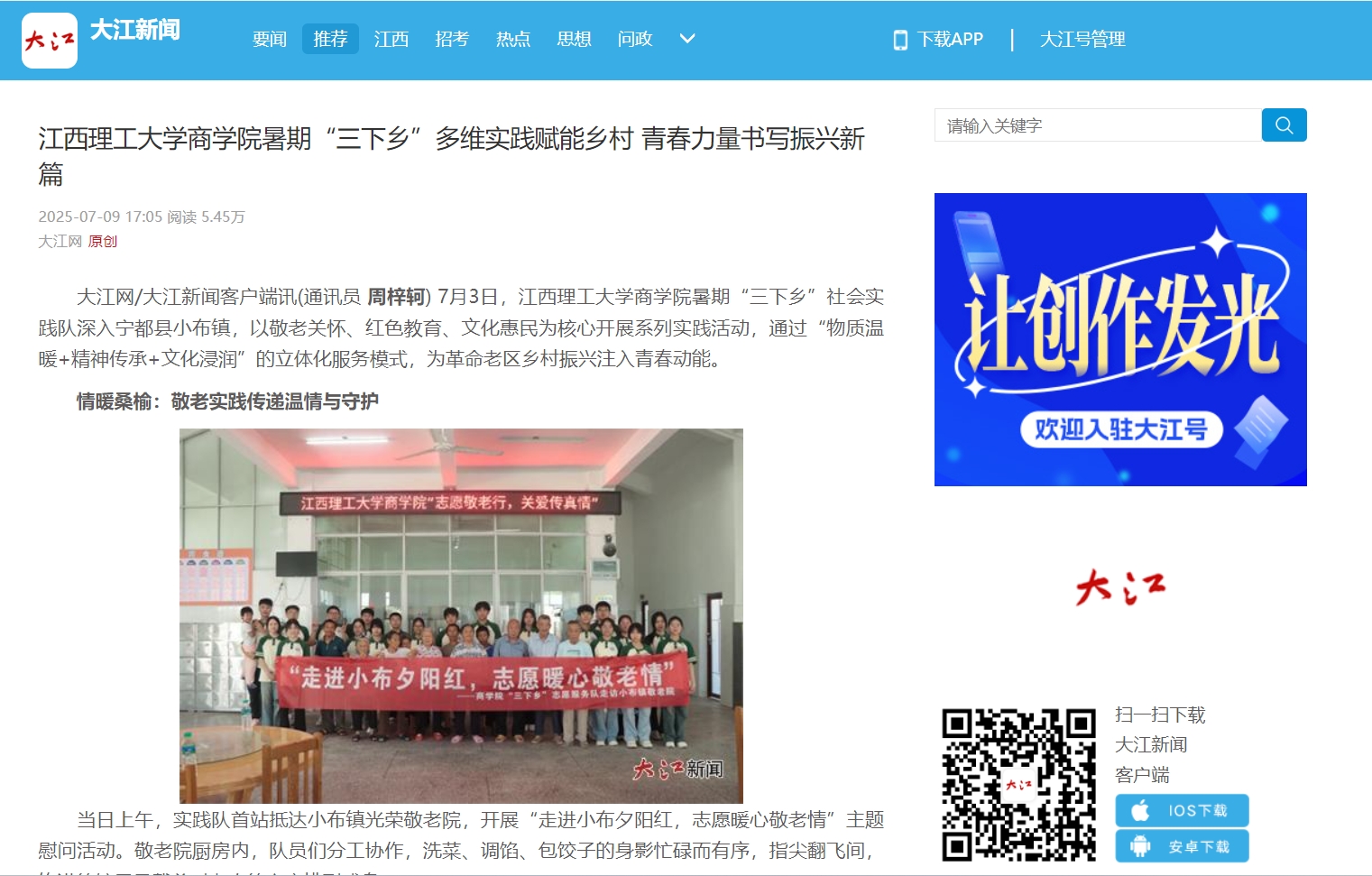 暑期“三下乡”社会实践队深入宁都县小布镇,以敬老关怀、红色教育、文化惠民为核心开展系列实践活动,通过“物质温暖+精神传承+文化浸润”的立体化服务模式,为革命老区乡村振兴注入青春动能。