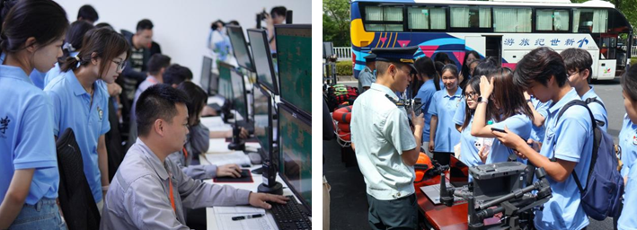 图左为气象局工作人员向队员展示气象监测系统 图右为应急管理局工作人员讲解应急器械的使用 马健平、张雨琛 供图