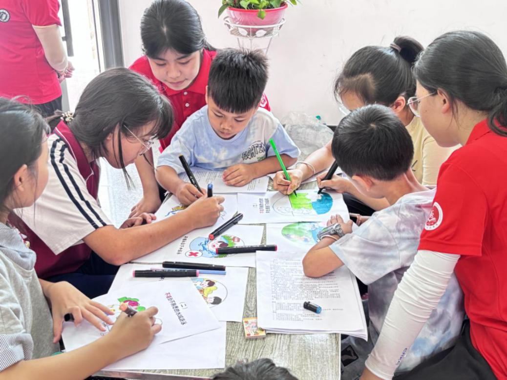 ▲队员们带领孩子们绘制手抄报 摄影丨刘智敏