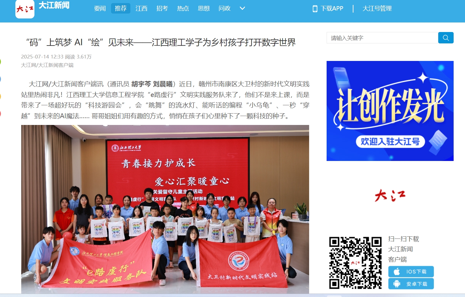 学子们走出校园、服务乡村的温暖实践。他们用自己学的专业知识,变着花样给村里的孩子们打开科技新世界的大门。这不仅仅是一次活动,更是为乡村的未来,悄悄点亮了一盏盏希望的灯。实践队将高校育人成果转化为服务社会的动能,为缩小城乡数字鸿沟、推动教育公平与乡村振兴贡献专业力量。