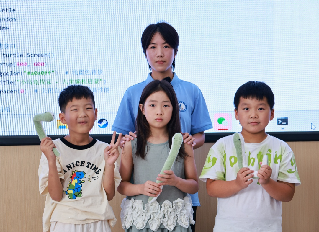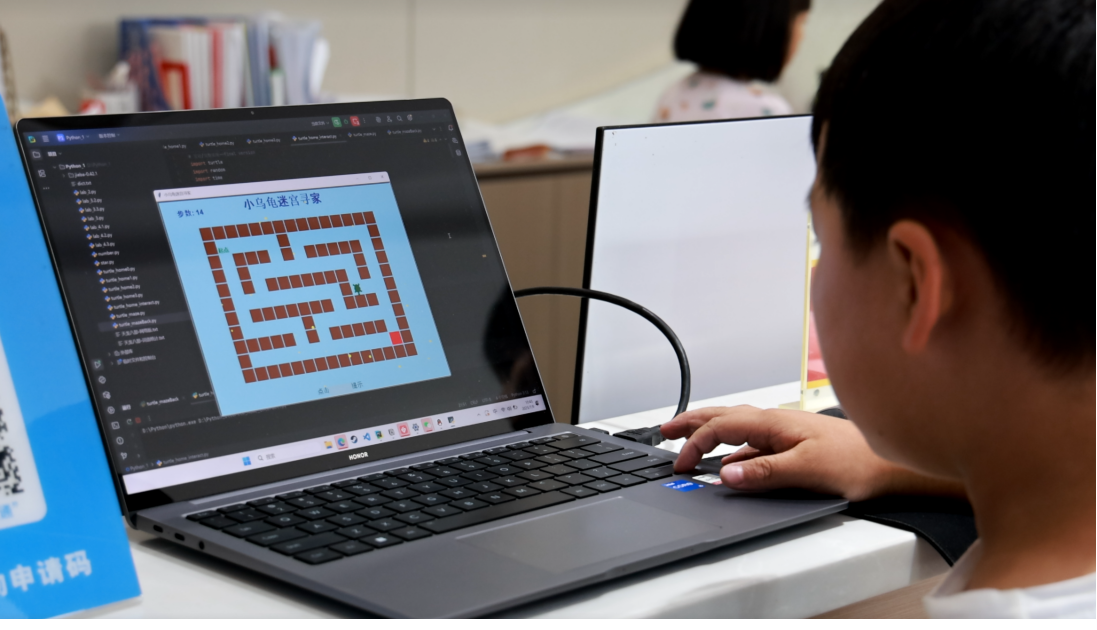 “小乌龟找家”Python编程游戏点燃了现场热情。孩子们化身“小小指挥官”,输入“forward”“left”等指令,引导屏幕上的小乌龟穿越迷宫。“撞墙啦!”“成功啦!”的欢呼声此起彼伏。实践队员适时引导孩子们规划路径,让他们在游戏中直观体会编程逻辑和计算思维的魅力,破除了对代码的陌生感。