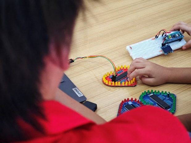 ▲实践队员用电脑操控流水灯 摄影丨李展翼