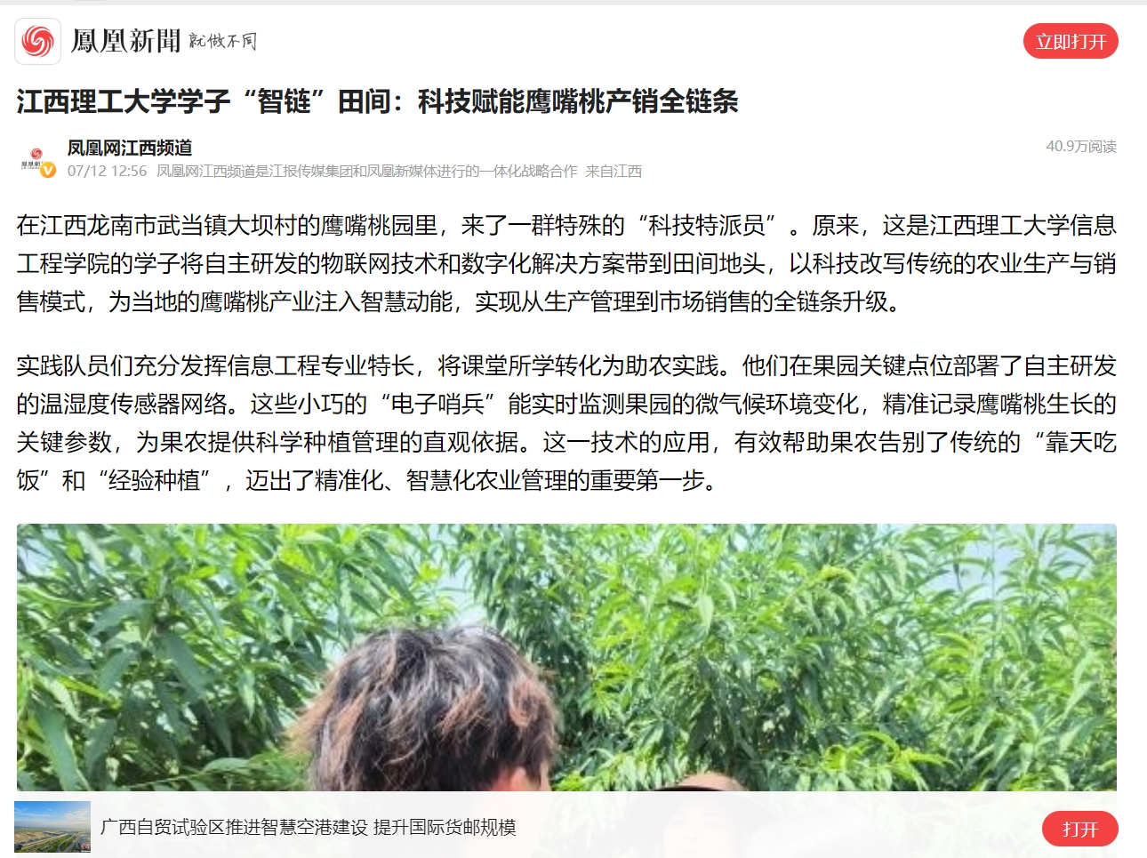 通过此次社会实践活动,不仅为龙南鹰嘴桃产业插上了数字化翅膀,有效促进了农民增收,更探索出一条可复制、可推广的“高校智慧助农”新路径,充分彰显了新时代青年学子学以致用、服务社会、贡献乡村的责任担当。(文/胡宇芩、刘晨曦)