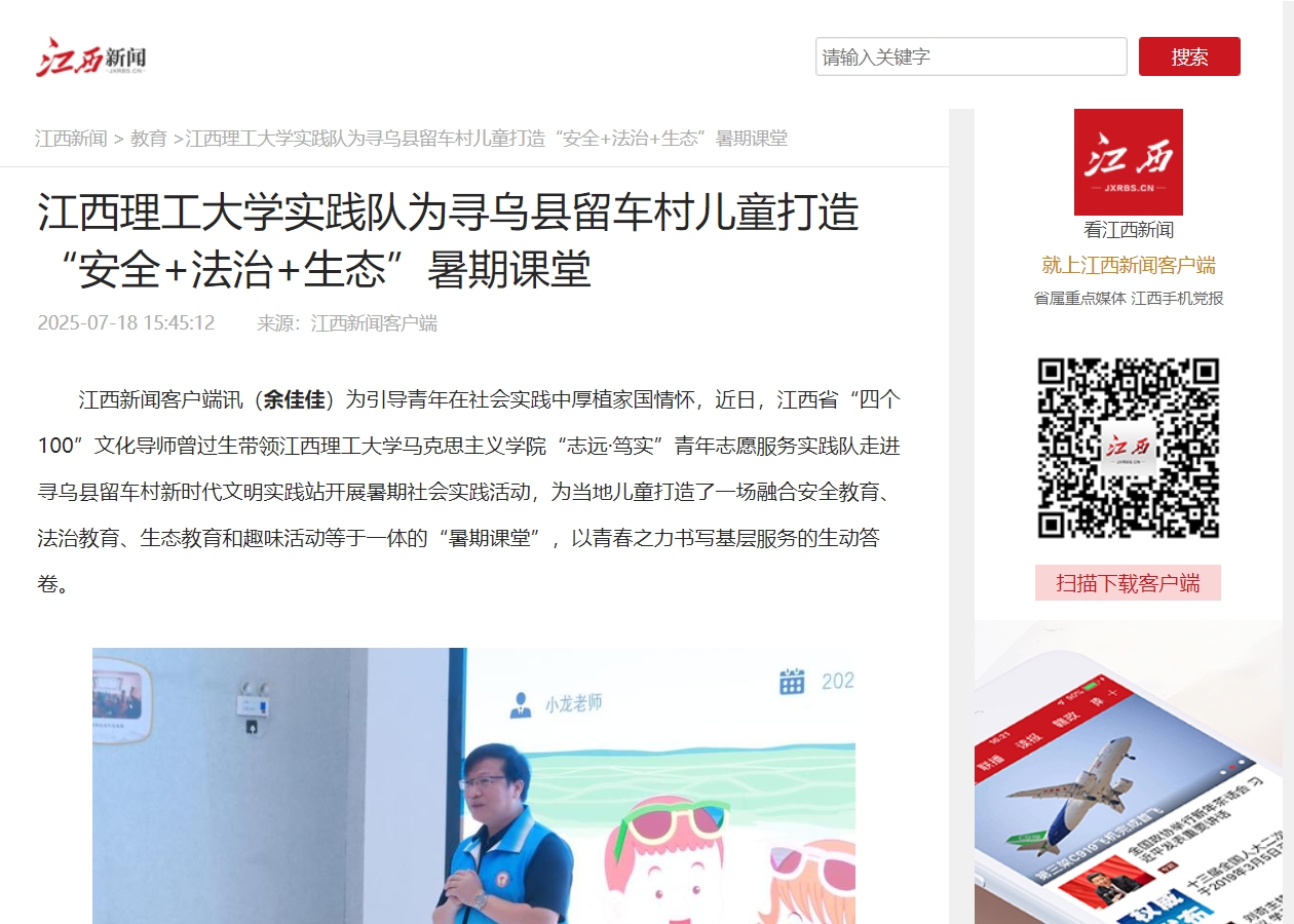 “志远·笃实”青年志愿服务实践队走进寻乌县留车村新时代文明实践站开展暑期社会实践活动,为当地儿童打造了一场融合安全教育、法治教育、生态教育和趣味活动等于一体的“暑期课堂”,以青春之力书写基层服务的生动答卷。