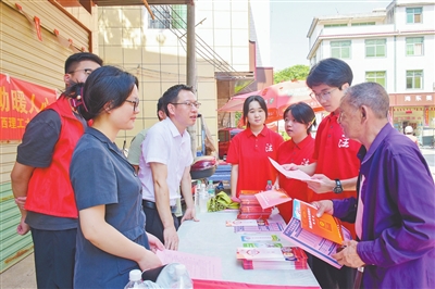 在黄安村圩场宣讲台前,学生王鑫妮熟练地架起手机开启直播。椅子还未坐热,便有村民拿着皱巴巴的合同挤到她面前进行咨询。“年轻人,来帮我看看这承包协议有没有漏洞?”王鑫妮闻声接过合同逐项查看,并将其作为鲜活案例同步在直播间讲解,对其中存在的风险进行剖析。“打开手机就能学法,还能问自家遇到的难题,可太方便了!”村民杨群赞不绝口。