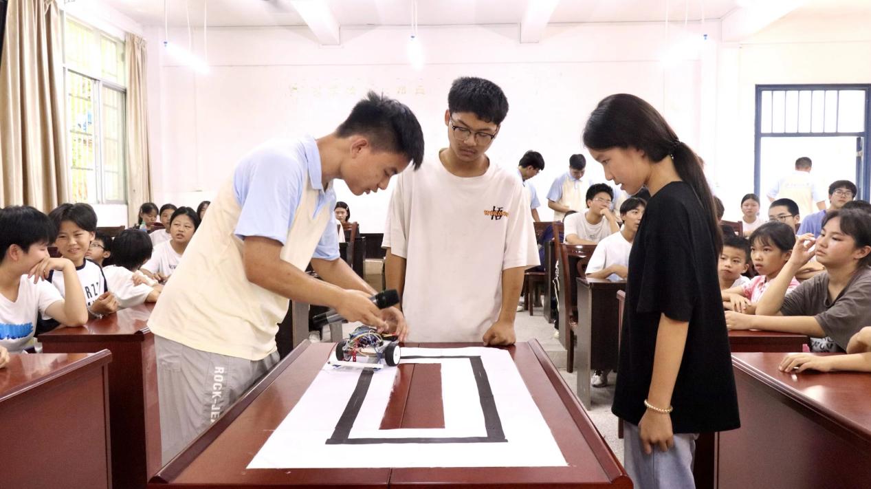 点阵屏互动、蜂鸣器演奏旋律、寻迹小车自主稳定行驶……系列有趣的活动与场景深深吸引了孩子们。面对“小车为什么会自己拐弯?”的疑问,队员们将传感器比作“眼睛”感知倾斜,控制器比作“大脑”快速计算调整电机,通俗解释复杂的反馈控制算法。队员们耐心答疑,手把手指导操作,扎实传递电学常识。