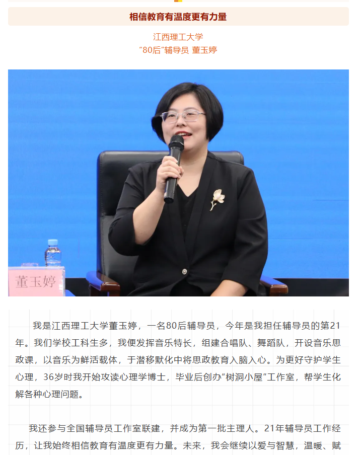 我还参与全国辅导员工作室联建,并成为第一批主理人。21年辅导员工作经历,让我始终相信教育有温度更有力量。未来,我会继续以爱与智慧,温暖、赋能更多学生。