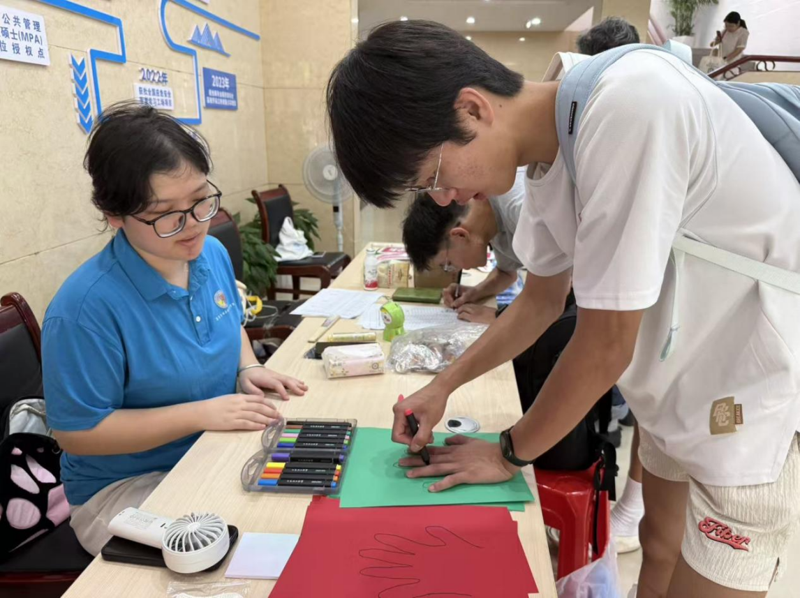 楼一楼大厅的“青春之门”,同学们用红、蓝、绿三色水笔创作画下一个个“青春手印”,留下一条条对大学的初印象,共同绘就一幅“新生手印图鉴”。“红色代表忠诚与担当,蓝色代表专业与精益,绿色象征安全与使命,我们希望通过这样的互动设计传递大发娱乐
