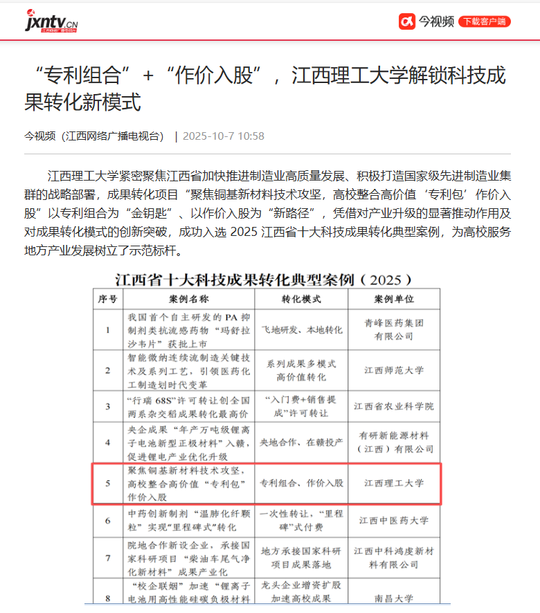 紧密聚焦江西省加快推进制造业高质量发展、积极打造国家级先进制造业集群的战略部署,成果转化项目“聚焦铜基新材料技术攻坚,高校整合高价值‘专利包’作价入股”以专利组合为“金钥匙”、以作价入股为“新路径”,凭借对产业升级的显著推动作用及对成果转化模式的创新突破,成功入选 2025 江西省十大科技成果转化典型案例,为高校服务地方产业发展树立了示范标杆。