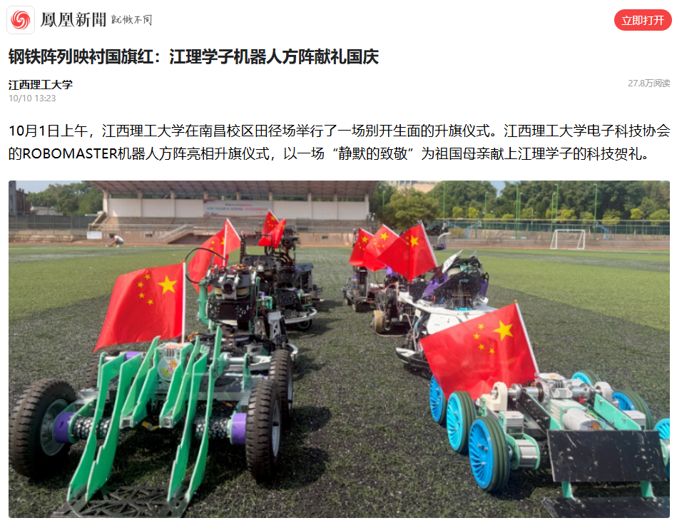 《凤凰新闻》:钢铁阵列映衬国旗红:江理学子机器人方阵献礼国庆