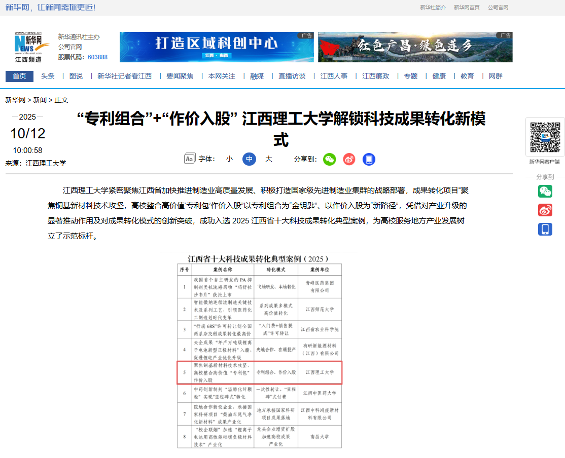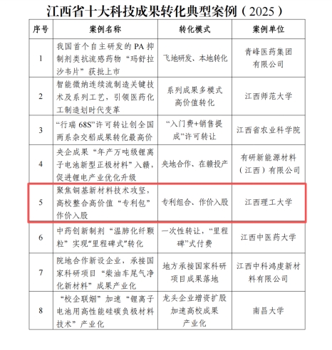 紧密聚焦江西省加快推进制造业高质量发展、积极打造国家级先进制造业集群的战略部署,成果转化项目“聚焦铜基新材料技术攻坚,高校整合高价值‘专利包’作价入股”以专利组合为“金钥匙”、以作价入股为“新路径”,凭借对产业升级的显著推动作用及对成果转化模式的创新突破,成功入选 2025 江西省十大科技成果转化典型案例,为高校服务地方产业发展树立了示范标杆。