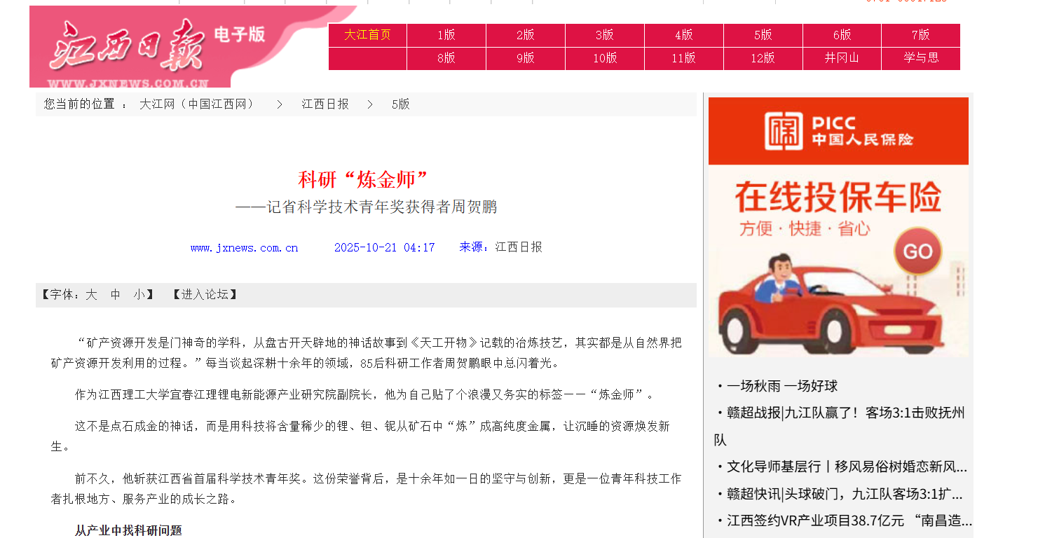 “一辈子很短,做不了太多事,能为新能源汽车、锂电池、光伏产品贡献力量,就够了。”这份朴素的坚守,正是新时代青年科技工作者的担当。在周贺鹏看来,科研的真谛不仅在于千百次重复实验中的严谨求实,更在于漫长岁月里对目标的执着。就像他从低品位矿产中“炼”出高纯度金属一样,青春也需要经过磨砺,才能绽放最耀眼的光芒。