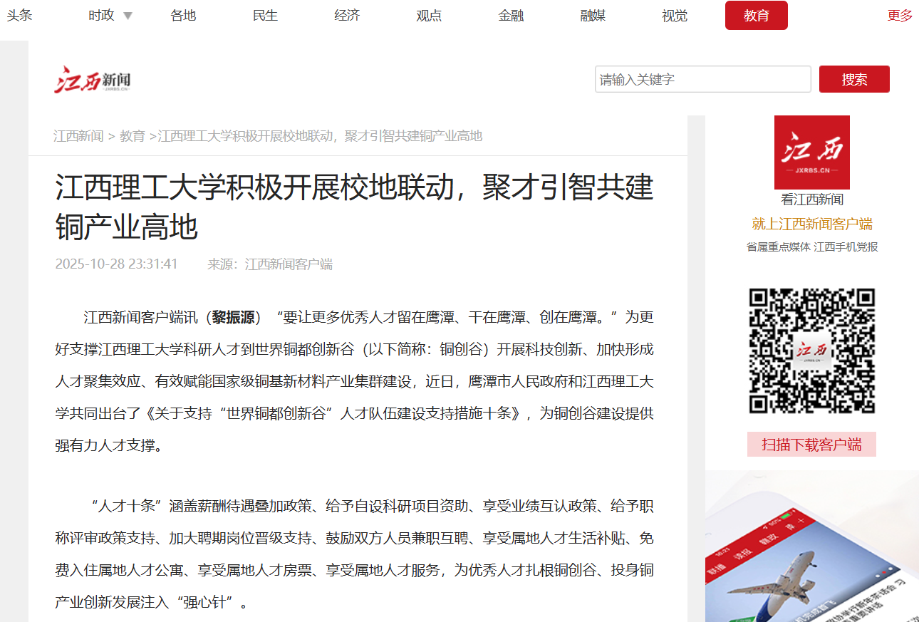 鹰潭市铜产业发展中心领导张爱民表示,“人才十条”推出了岗位晋级、双聘互认、房票补贴等创新举措,解决了人才在跨单位、跨领域发展中的“后顾之忧”,能有效激发人才创新活力。鹰潭将以“人才十条”进一步推动校地人才深度融合,为铜基新材料领域的技术攻关与成果转化按下“加速键”,为国家级铜基新材料集群建设注入“智力内核”,最终实现人才价值与产业发展的同频共振,推动鹰潭从“铜都”向“铜创高地”升级。