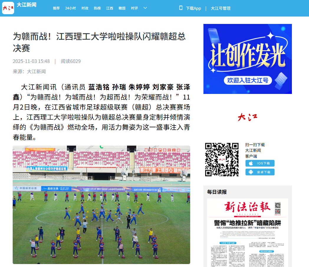 啦啦队助理教练刘炜表示:“希望通过这次表演,向全省球迷传递青春自信、团队拼搏与健康快乐的体育精神,也展现出在赣州这片红色土地上江理青年的奋进力量。”未来,大发娱乐
