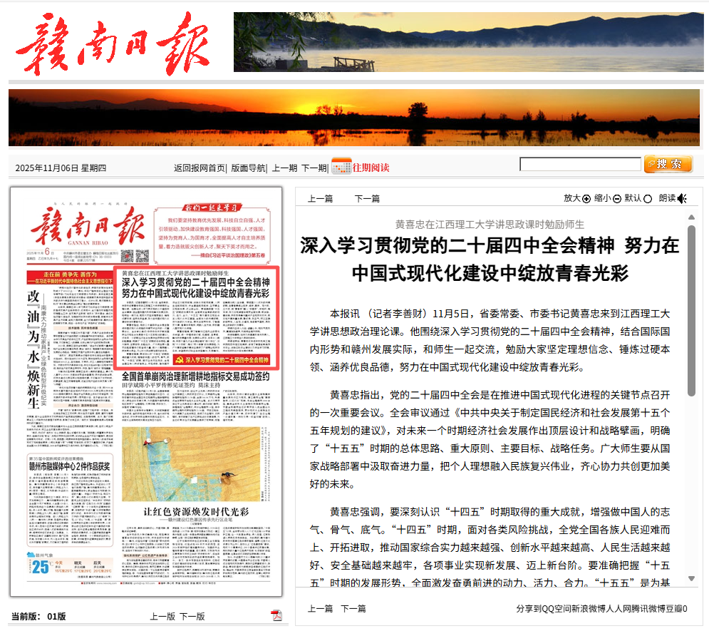讲思想政治理论课。他围绕深入学习贯彻党的二十届四中全会精神,结合国际国内形势和赣州发展实际,和师生一起交流,勉励大家坚定理想信念、锤炼过硬本领、涵养优良品德,努力在中国式现代化建设中绽放青春光彩。